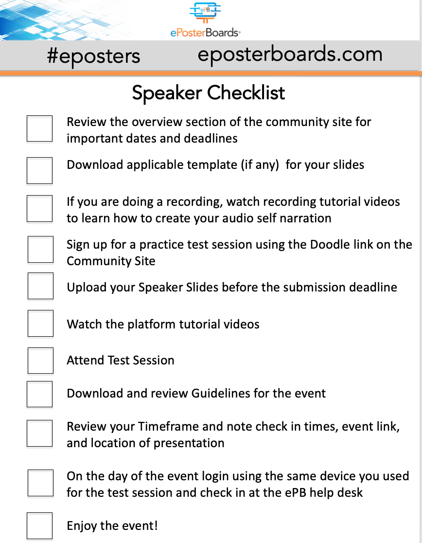 All Speakers are required to attend a test session to familiarize themselves with how the ePoster Session will run. The test session gives you the opportunity to handle any potential technical issues and it’s a dress rehearsal on what to expect during the actual ePoster Session.